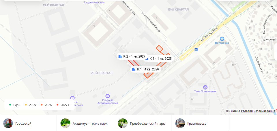 В 800 метрах от ЖК находится остановка общественного транспорта «ТК Академический».